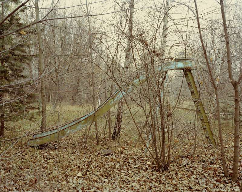 Kander’s camera appears to stand and stare at this paused, post-traumatic world, like a witness. The only sound came from his Geiger counter, monitoring the invisible radioactivity that will be present for hundreds of years. Nature encroaches and all that is manmade is slowly being consumed.